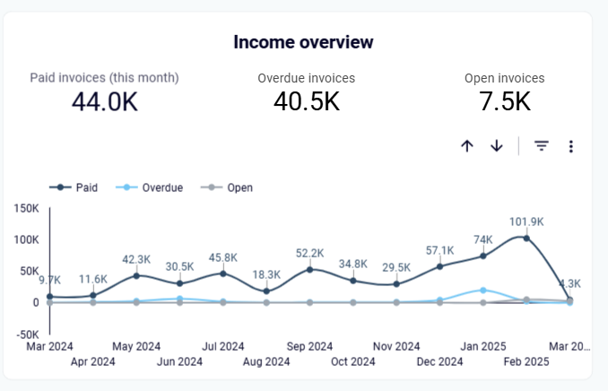 The income overview report enables you to track overall revenue trends for the last 12 months. This visualization helps you identify seasonal fluctuations, peak revenue periods, and any unexpected dips in income. The report shows the revenue distribution by customers and products, helping you understand which segments drive your business. By analyzing these patterns, you can adjust your strategies to maximize revenue opportunities and address potential shortfalls before they impact your bottom line.